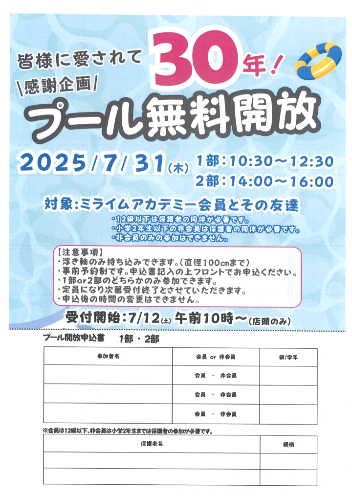 創業30周年記念イベント開催!プール無料開放のお知らせ