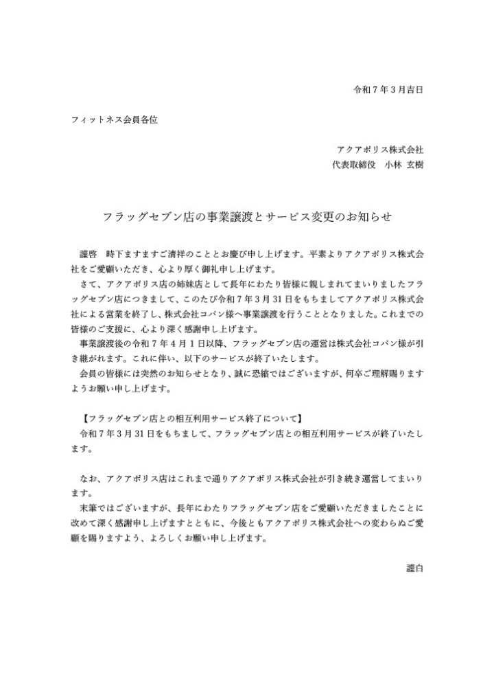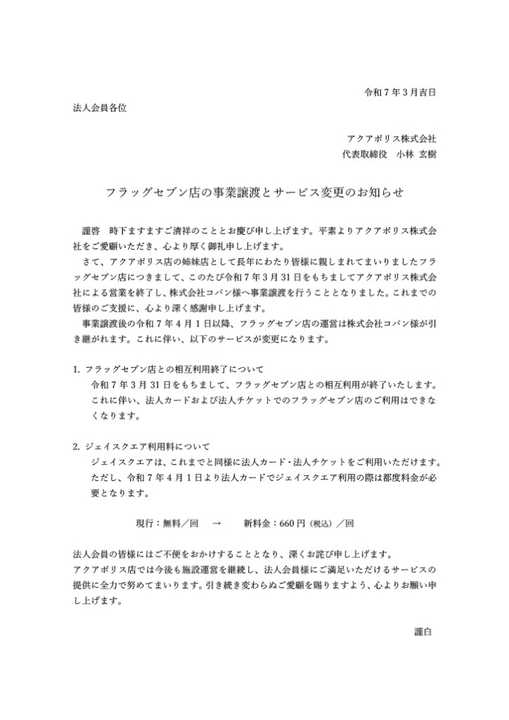 フラッグセブン店の事業譲渡とサービス変更のお知らせ <アクアポリス>
